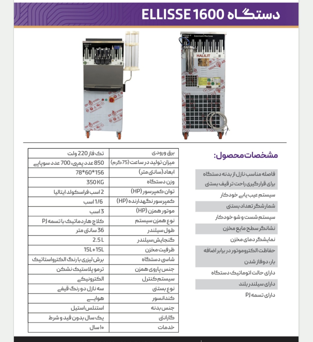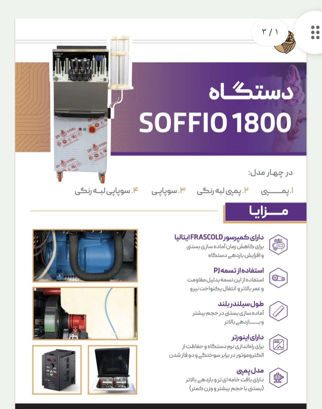 سوپاپی اینورتر دار برق ورودی3فاز . 380 ولت میزان تولید در ساعت (75)گرم 1000 (عدد پمپی 850 عدد سوپاپی ) ابعاد 78*60*156 وزن دستگاه 350kg توان کمپرسور (hp 3 ) اسب فراسکلد ایتالیا